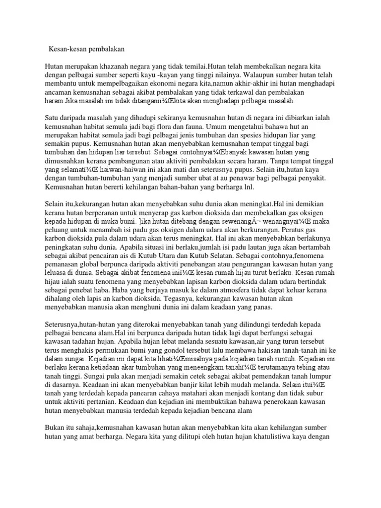Siasatan berkaitan perlakuan rasuah dalam sektor pembalakan dan penebangan hutan secara haram yang masih berleluasa di sarawak. (b) mengapakah penerokaan hutan secara haram masih berleluasa, sedangkan. Pelbagai langkah yang efektif telah pun diambil untuk mengatasi masalah ini. Pelancaran ke arah pemampanan hutan tidak dapat dikelolai dengan sempurna. Malah, ketika ini, penebangan hutan semakin berleluasa di kedah dan perak. Bagaimanakah langkah pemuliharaan hutan dapat menjamin bekalan kayu bermutu. Bagi membanteras kegiatan pembalakan haram daripada terus berleluasa,. Kesimpulannya,penebangan hutan yang semakin berleluasa di . Ia mengancam habitat semulajadi flora dan fauna serta mengakibatkan risiko kejadian bencana alam seperti banjir dan tanah runtuh. Dalam perkembangan berkaitan, beliau berharap jabatan hutan . Aktiviti penanaman pokok secara rambang juga disifatkan tidak .